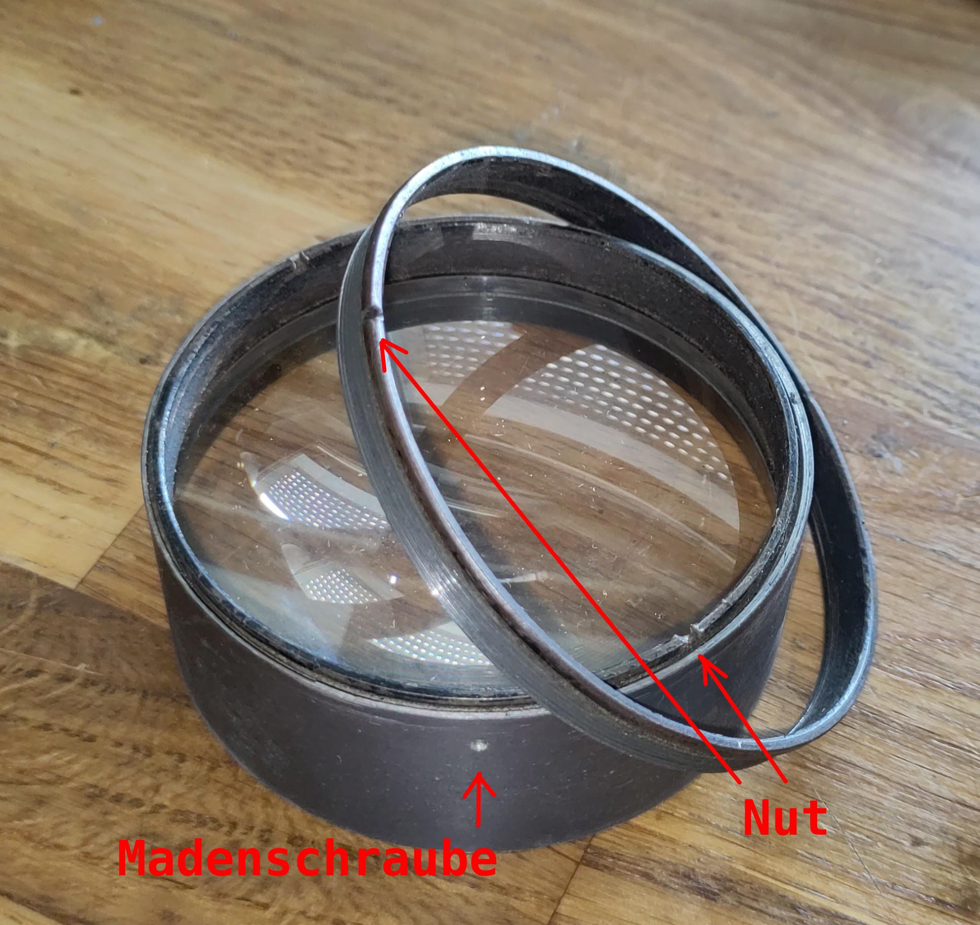 Das Bild zeigt die Mitnahmenuten der Gewinderinge und wie filigran die Gewinde sind. IMMER erst nach den Madenschräubchen suchen. Sie arretieren die Ringe.