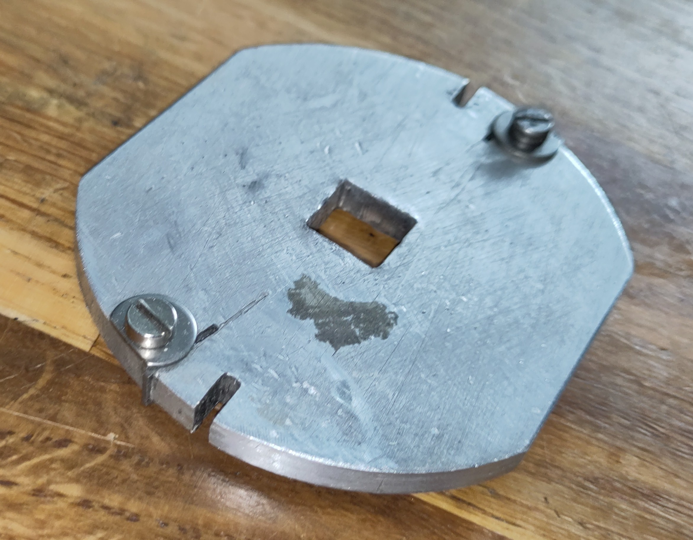 Mein selbst gebautes Werkzeug, um die inneren Ringe zu lösen. Gefeiltes Vierkantloch in der Mitte für eine 1/2 Zoll Ratsche. Die Mittnehmerbleche sind von einer Fühlerlehre in der passenden Stärke abgeschnitten, in gesägte Nuten geklebt und gesichert.