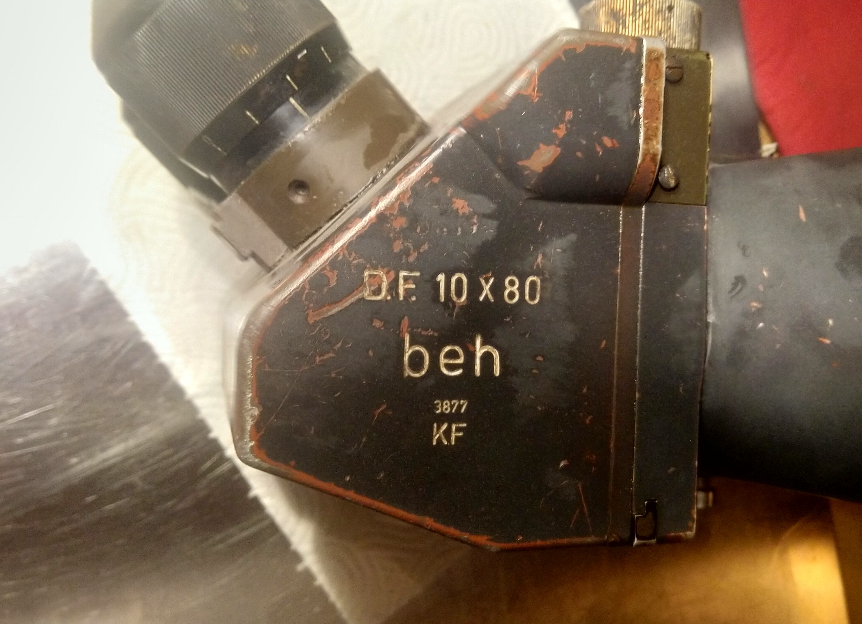 Vor einigen Jahren bin ich zu einem D.F. 10x80 Flakglas der deutschen Wehrmacht gekommen. Ein vollständiger Satz mit Stativ ist im Fernglasmuseum gut beschrieben. Aber hier geht es auch zu den Innereien.