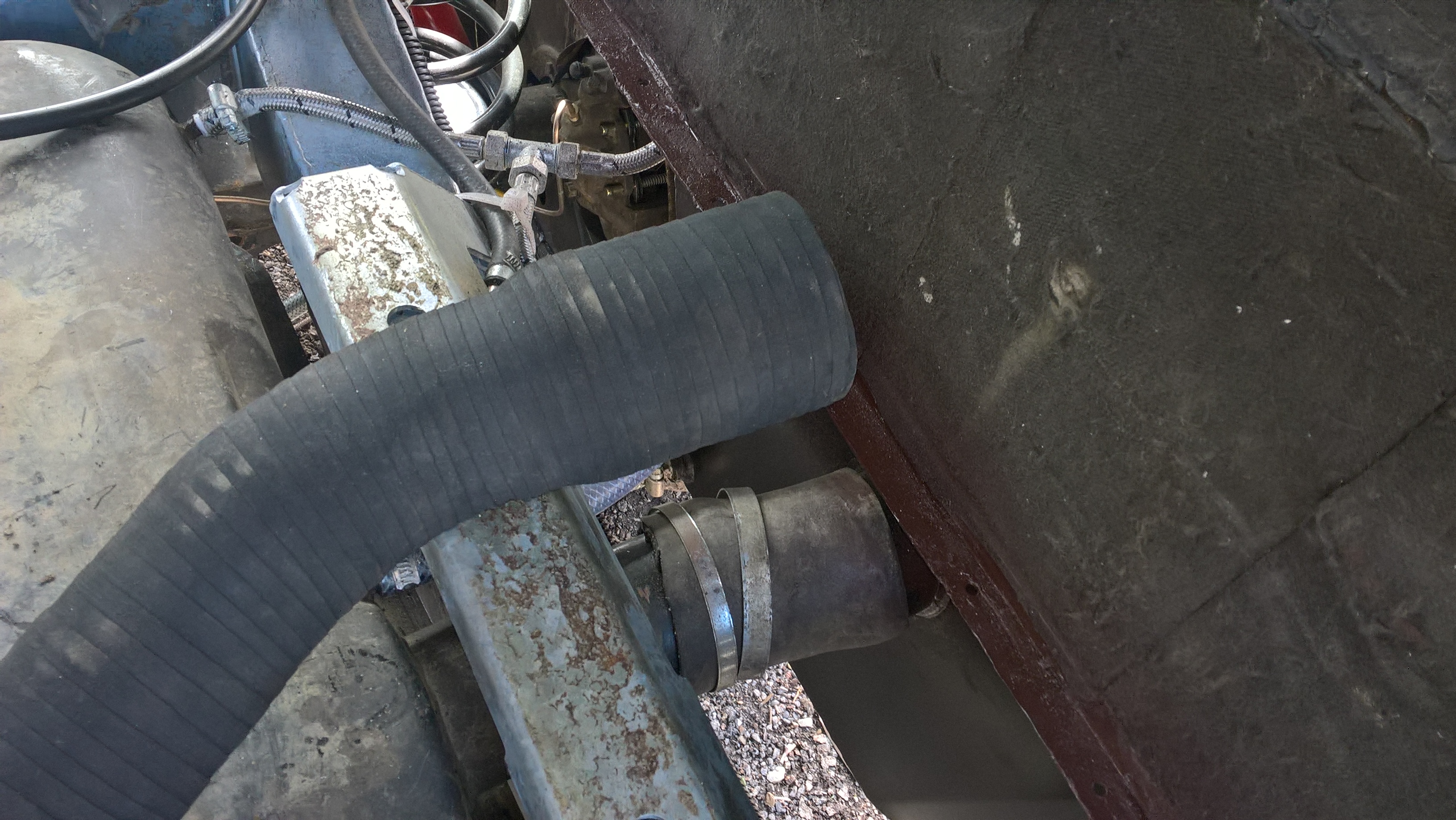 Der Durchlauftank ist ein ca. 35 Liter grosser Behälter, der den leeren Raum im rechten hinteren Kotflügel nutzt und eigentlich nichts anderes macht, als den Schlauch vom Tankstutzen zum Haupttank um diese 35 Liter aufzublähen. Die Tankuhr verhält sich dadurch etwas skuril, denn sie bewegt sich erst nach einigen 100 km, wenn der Durchlauftank leer gelaufen ist. Mein original Tank hat eine Kapazität von 80 Litern und so ergibt das zusammen bei einem Durchschnittsverbrauch von 10,5 Litern eine Reichweite von knapp über 1000 km. Auf Reisen hat sich das sehr bewährt.