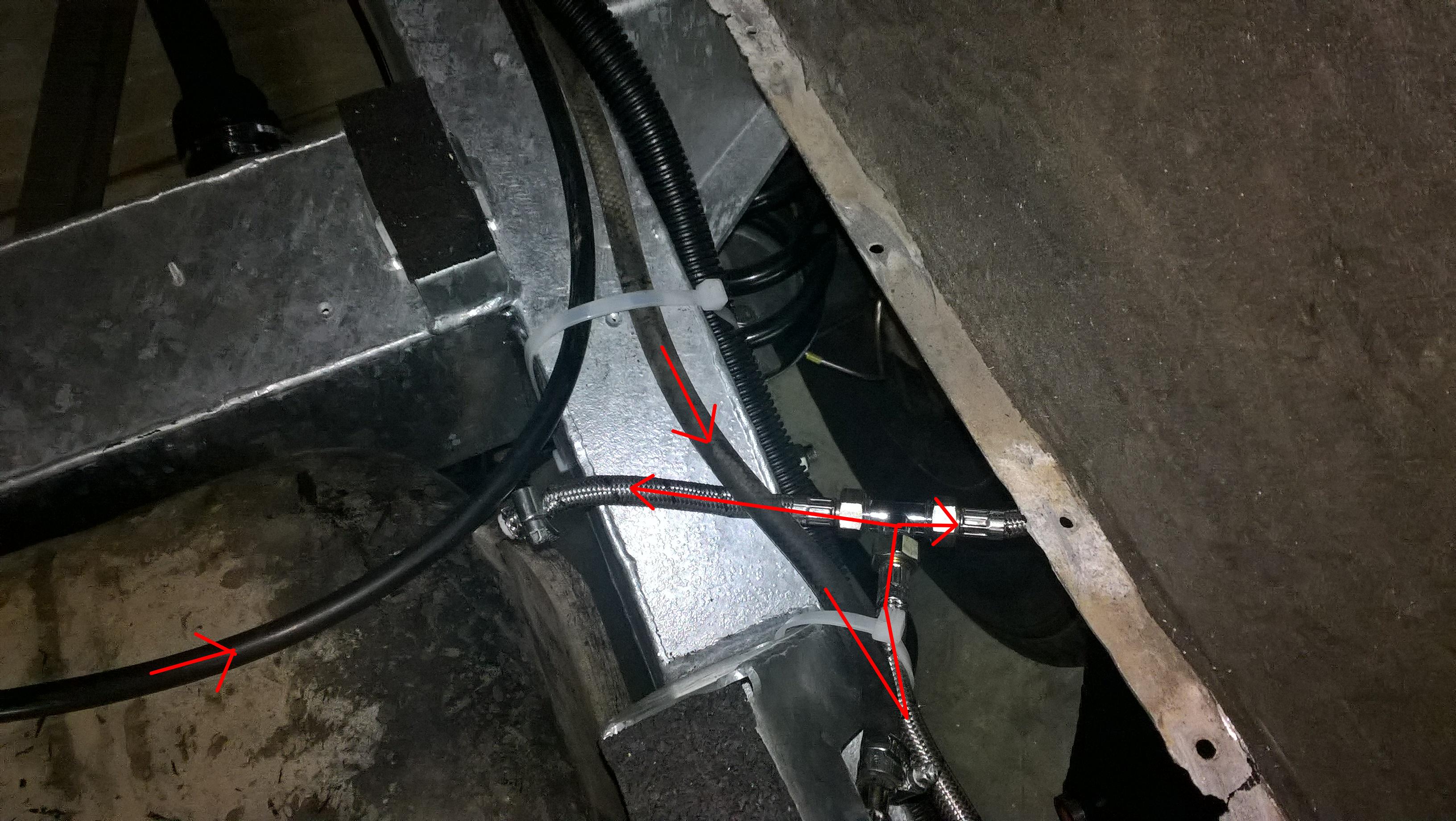 Den Rücklaufschlauch von der ESP (siehe rote Pfeile) führte ich zu einem T-Stück und verband alle Entlüftungen mit den Stahlflex Leitungen. So konnte der Rücklauf auch in den Durchlauftank fliessen.
