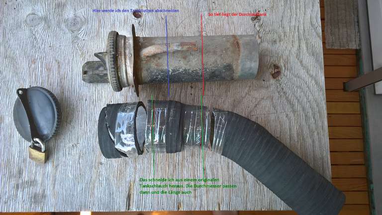 Ich fing also mit der Verbindung zum Tankstutzen an, der schon mal einen deutlich grösseren Durchmesser hat.Es ist noch der alte Tankstutzen der Serie Modelle. Es ergab sich zum Glück, dass die Verjüngung am oberen Ende des originalen Schlauches exakt passte.