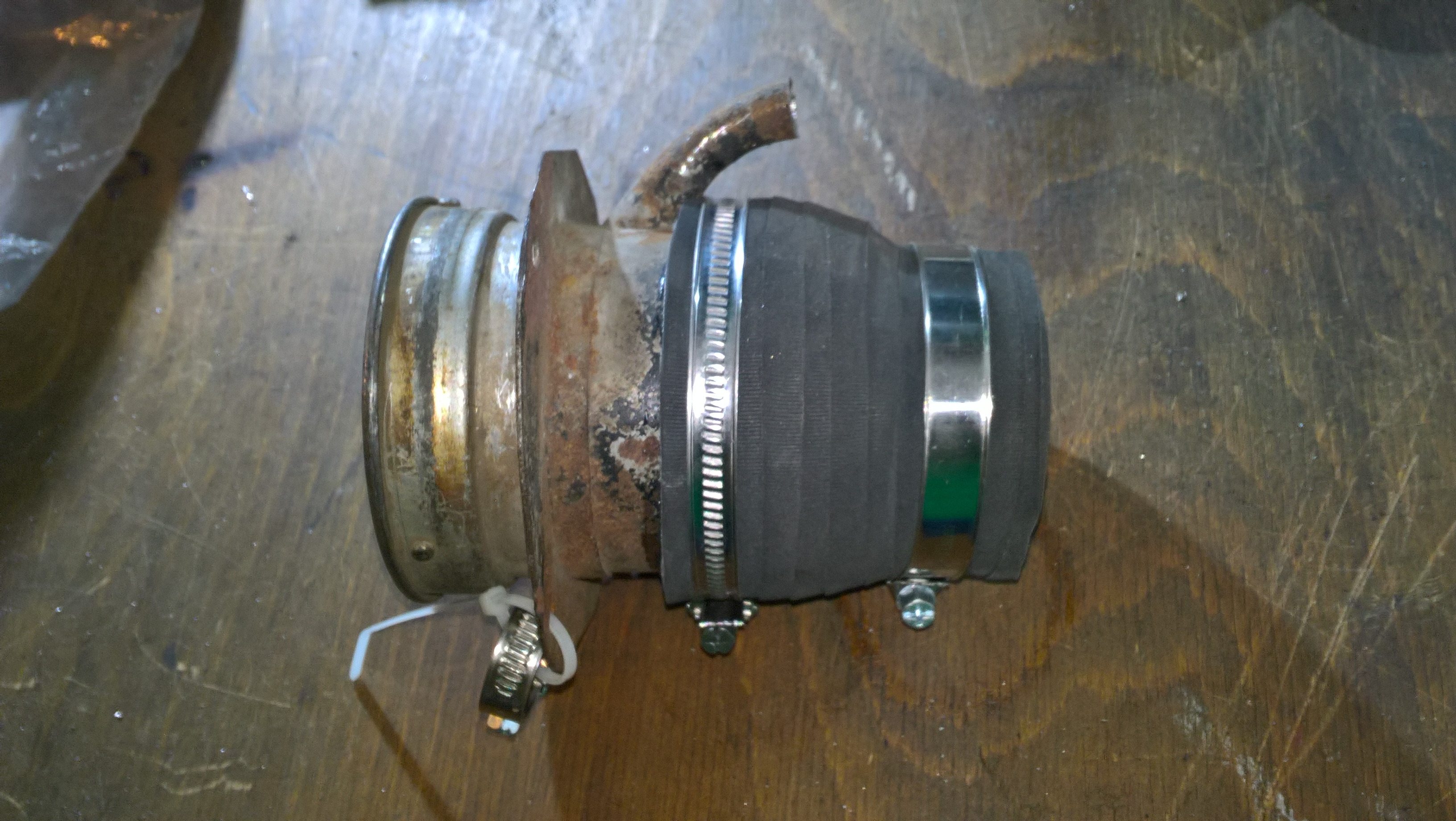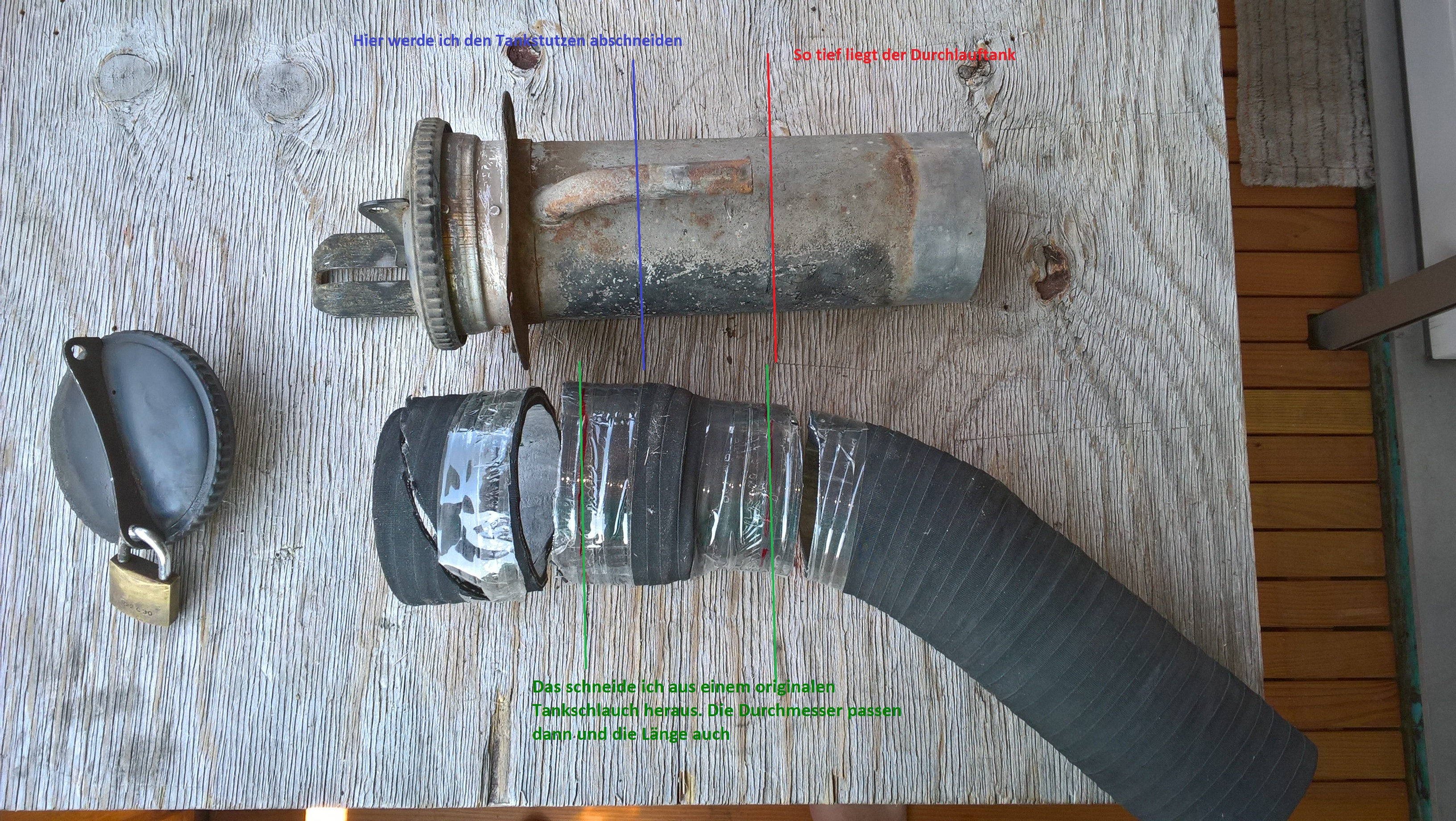 Ich schnitt das Entlüftungsrohr des Stutzens ab und kürzte ihn. Der Abschnitt des Schlauches stellte die perfekte Verbindung zum Durchlauftank dar.