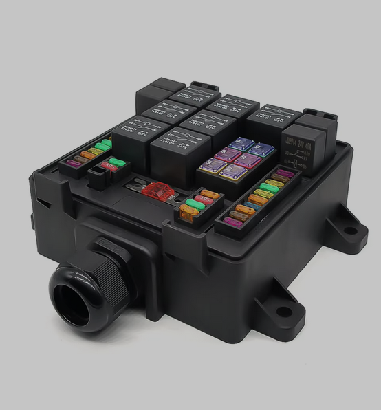 Ebenfalls bei Aliexpress fand ich diese Box mit verschiedenen Relais und Sicherungen. Im unteren Teil ist genügend Platz für den Arduino, Relaistreiber und Freilaufdioden. Anzumerken ist nur, dass die Kabeldurchführung wirklich riesig ist. Die quadratischen bunten Flächen sind Sicherungen und die Flachsicherungen sind die kleine Variante. Die Relaise sind alle da. 1 bis 80A, 6 bis 40A und 4 bis 20A. Der Deckel ist sauber abgedichtet, aber beim Boden muss man selbst aktiv werden, was jedoch gut möglich ist. 60€ kostet diese Box.