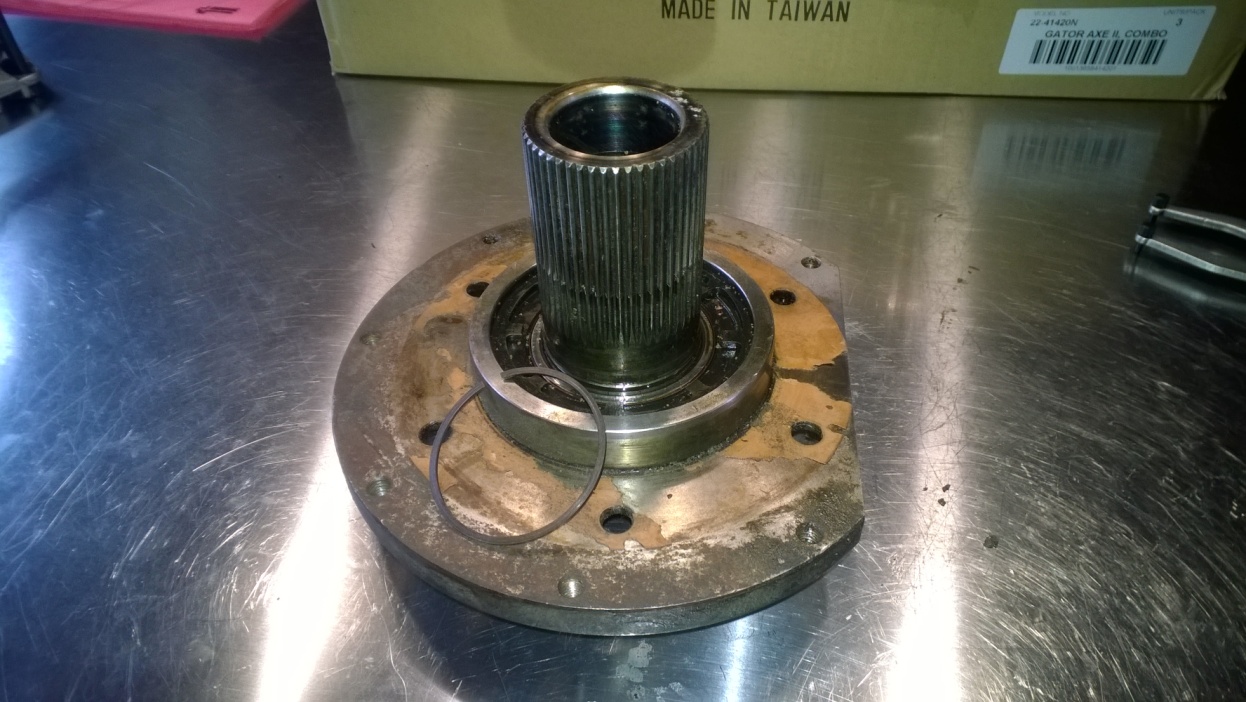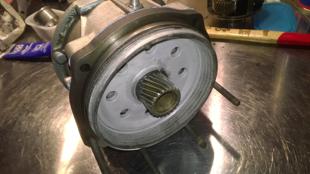 Am OD werden nun die ½“ Muttern und die beiden Inbusschrauben gelöst und der vordere Teil des Gehäuses kann abgenommen werden. Zum Vorschein kommt der Aussenring des Planetenradsatzes (im englischen als Annulus bezeichnet) mit dem innen liegenden Planetenradsatz. Diese Glocke kann einfach mitsamt Planetenradsatz von der Welle gezogen werden und darunter wird die Welle, sowie die Innenseite der Konuskupplung sichtbar. In der Glocke befindet sich der Planetenradsatz, der Rollenfreilauf (englisch: unidirectional clutch) und die Druckscheibe aus Bronze (englisch: Thrust washer).