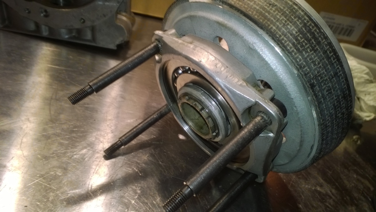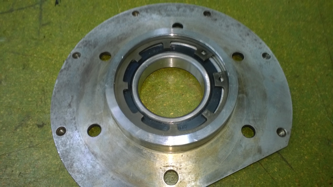 Als erstes habe ich den Adapter zum VTG zusammen gebaut. Das Lager wird auf einer hydraulischen Werkstattpresse in den Lagerschild gepresst. Wie an der schwarzen Lagerdichtung zu erkennen ist benutze ich nicht das original NTN Lager. Mal sehen ...
