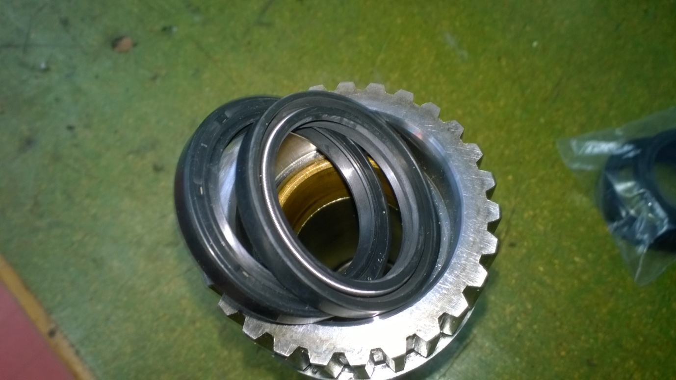Die Eingangswelle des OD ist mit 2 Wellendichtringen (40x52x7) abgedichtet. Sie sind sozusagen „mit dem Gesicht“ zueinander direkt nebeneinander in der Ausgangswelle eingepresst. Diese Besonderheit sorgt für die Abdichtung in beide Richtungen. Eine weitere Besonderheit ist die Abdichtung des Hauptlagers. Beim VTG läuft die Eingangswelle eigentlich zwischen zwei Kegelrollenlagern. Abgedichtet wird nach aussen durch den PTO Deckel.