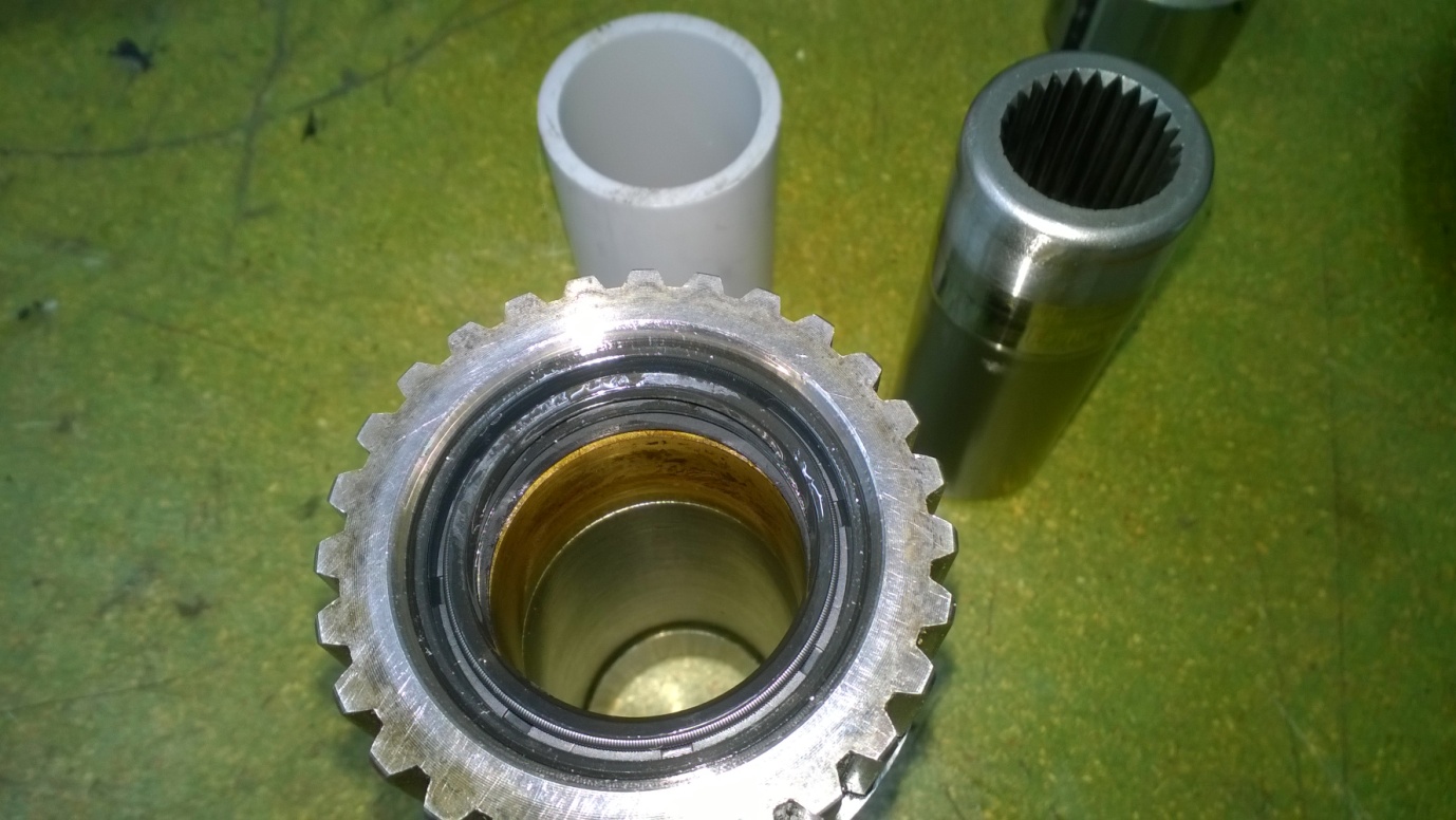 Zur Veranschaulichung sind die Wellendichtringe hier lose auf die Welle gelegt. Sie werden sozusagen mit dem „Gesicht“ zueinander eingebaut, damit in beide Richtungen kein Ölaustausch stattfinden kann. In der Bronzebuchse, die hinter den Dichtungsringen sichtbar ist läuft dann die Eingangswelle des OD. Im folgenden Bild steckt sie zur besseren Veranschaulichung ohne Dichtungsringe in der Ausgangswelle.