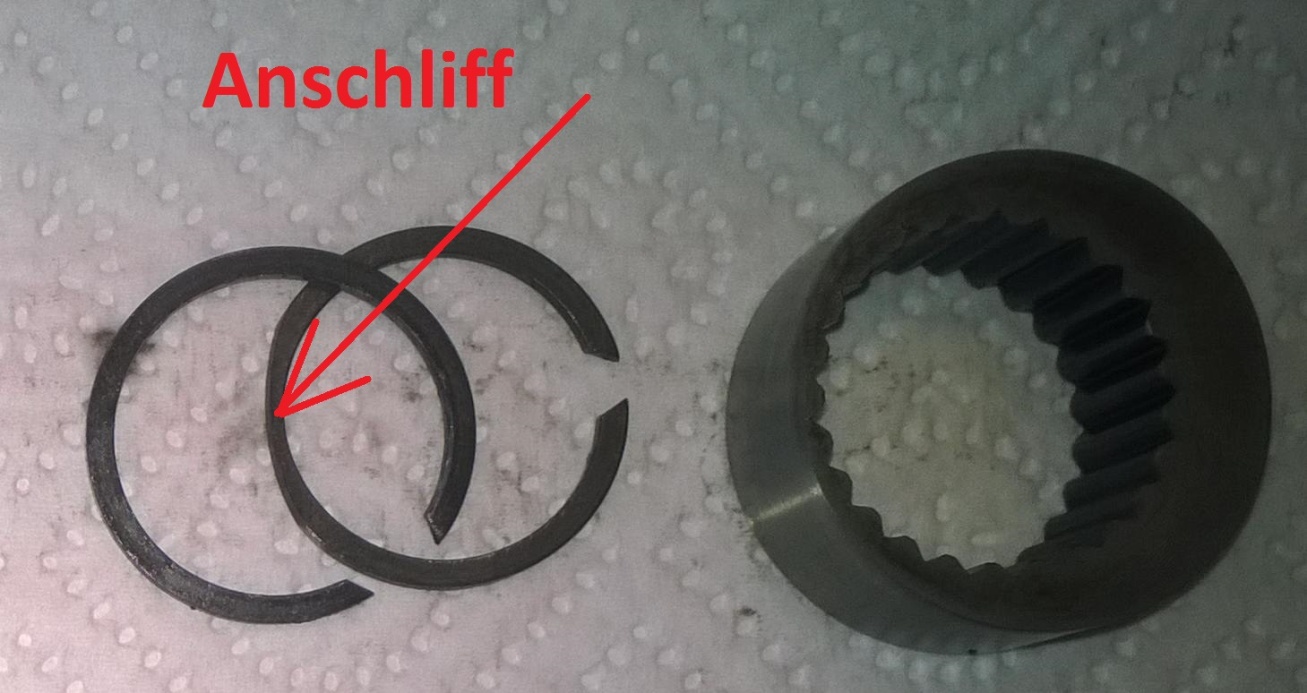 Jetzt wird der Sicherungsring MIT dem Anschliff auf die Welle gesetzt. Der Raum zwischen Welle und Exzenterfolger ist an der schmalsten Stelle so schmal, das kein unangeschliffener Sicherungsring Platz hätte.