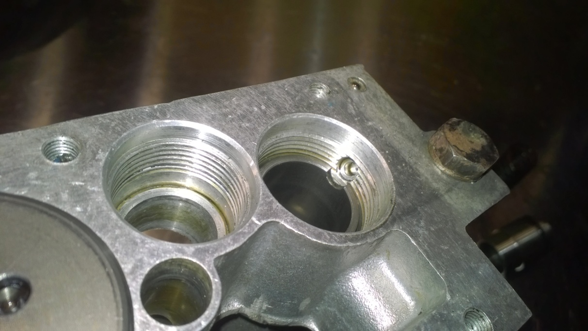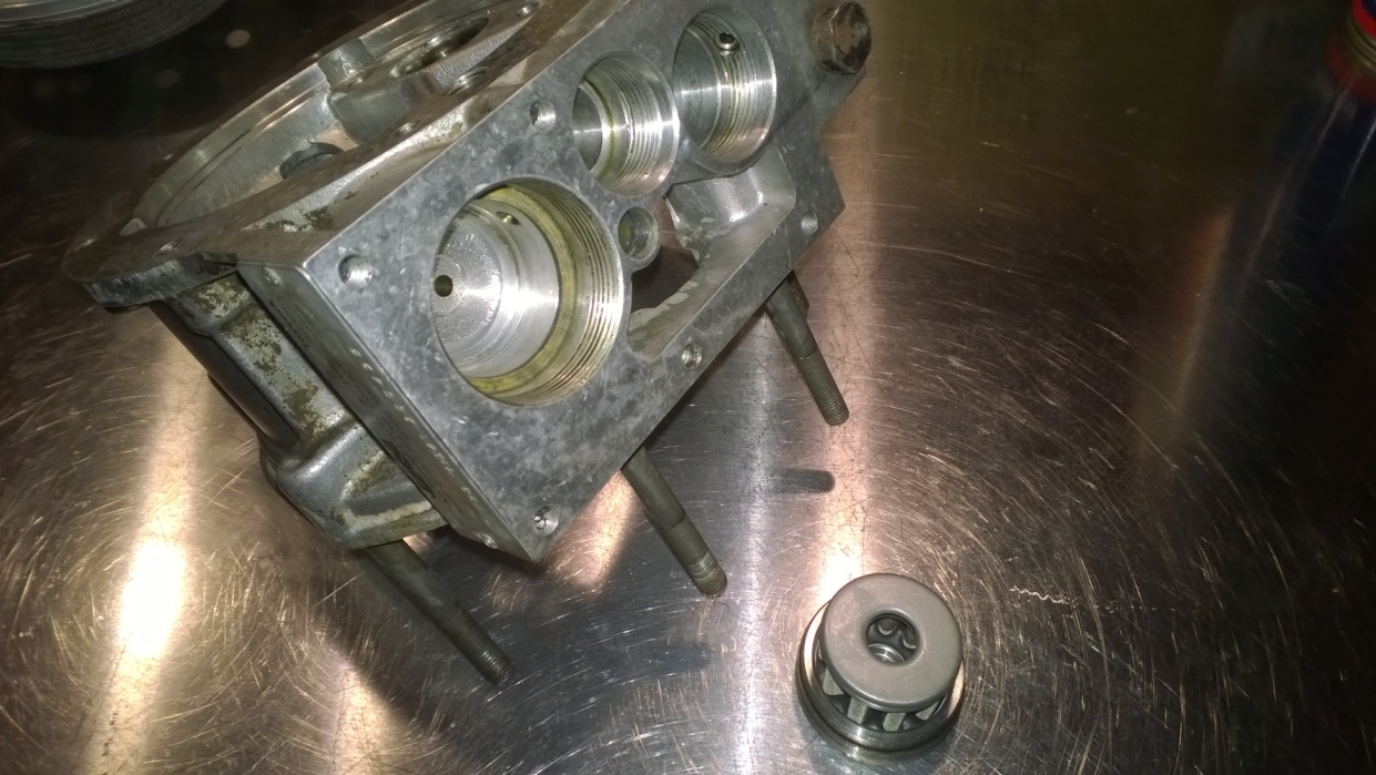 Der Ausbau des Hochdruckfilters ist völlig problemlos. Die Innereien des Druckspeichers (Dashpot) lassen sich bis auf den Ventilkörper ebenfalls gut aus dem Gehäuse klopfen. Der Ventilkörper wird durch Einschlagen des bereits erwähnten Bleistiftes gezogen. Meiner Meinung nach muss man den Ventilkörper aber gar nicht aus dem Gehäuse ziehen. ER trägt zwar 2 O-Ringe, die aber im normalen Betrieb niemals undicht werden sollten und deshalb auch nicht unbedingt gewechselt werden müssen. Reinigen kann man alles, indem man es mit Bremsenreiniger durch vorhandene Bohrungen ausspült.