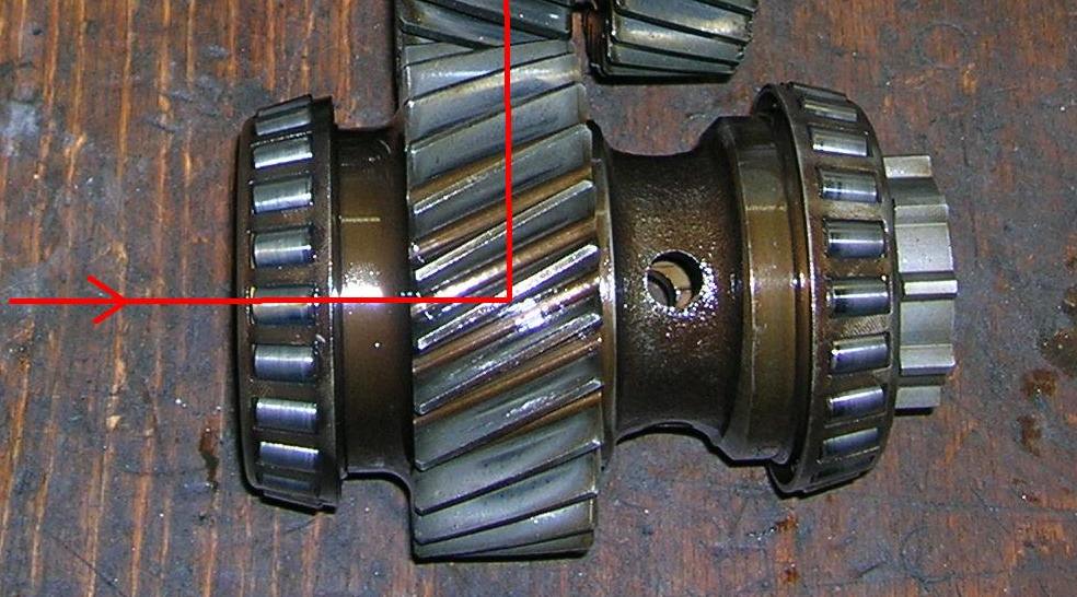 Hier ist die komplette Lagerung erkennbar. Das schrägverzahnte Zahnrad links ersetzt die Eingangswelle im VTG. Ganz links das Kegelrollenlager und in der Mitte das Rillenkugellager. Dazwischen sorgt die Federscheibe für die notwendige Vorspannung des Kegelrollenlagers.