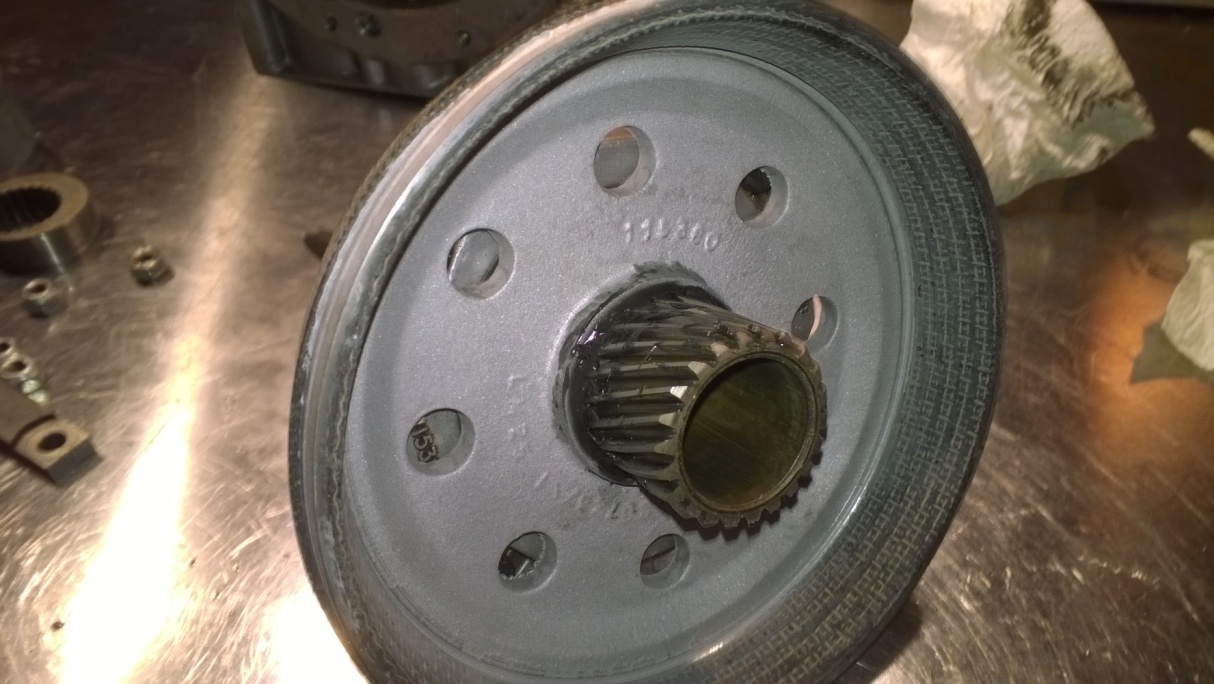 Erkennbar auf dem Foto ist, dass der äussere Kupplungsbelag mit ca. 2mm Stärke noch vollständig vorhanden ist, aber der innere Belag völlig abgeschliffen.