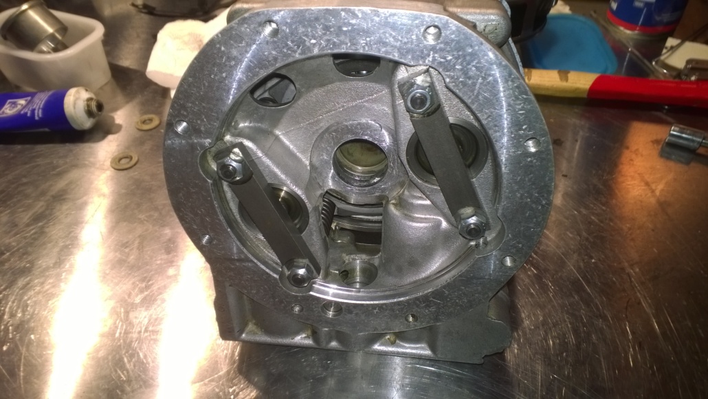 Nun wird der rückseitige Deckel abgeschraubt, unter dem der Antrieb der Ölpumpe, sowie die Federbrücken der Konuskupplung über den dazugehörigen Hydraulikkolben sichtbar werden. Nach lösen der 4 Muttern auf den Federbrücken wird die Konuskupplung mitsamt ihrem Drucklager und dem Drucklagerträger nach vorne aus dem Gehäuse von der Welle gezogen.