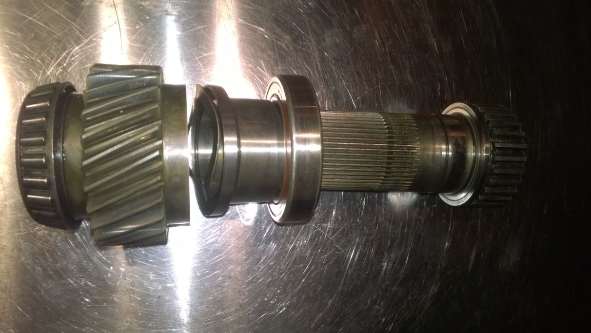 Diese Eingangswelle wird aber bei Montage des OD durch eine Eingangswelle im Adapter zum OD ersetzt. Gelagert wird diese Eingangswelle auf der Schaltgetriebeseite im standardmässigen Kegelrollenlager, auf der OD-Seite jedoch in einem beidseitig geschlossenem Rillenkugellager 6011, C3