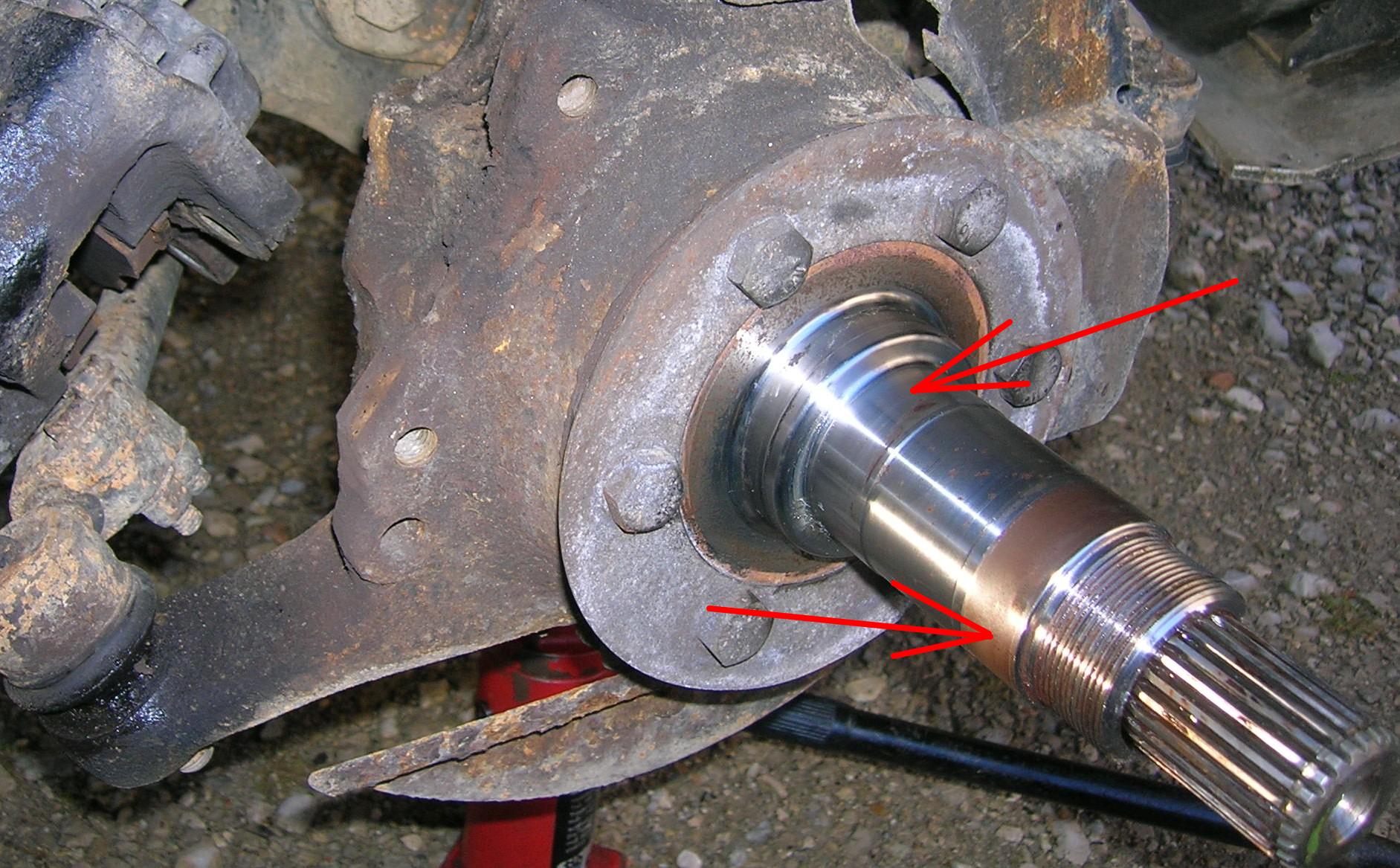 Das ganze Radlager wird dadurch stabiler und im Fehlerfall ist auch nicht mehr zwangsläufig der Achsstumpf defekt. Auf dem eingelaufenen Achsstumpf sieht man deutlich, wo sich die Innenringe der Lager drehen konnten.