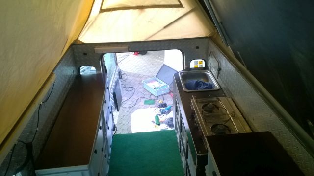 Er ist in konventioneller Bauweise aus Siebdruckplatten im Stil eines Regales gebaut. Aber alle Küchen-Utensilien und Lebensmittel sind in Euroboxen im Regal verstaut. Die Boxen werden gegen Herausfallen verriegelt und können komplett zum Kochen mit nach draussen auf die Sandbleche genommen werden. Der Optimus 155 Petroleum Bootskocher steht oben drauf in einem genau passenden Ausschnitt und ist selbst bei wildesten Offroadeinlagen noch nicht herausgefallen. Daneben ist ein Waschbecken mit Wasserhahn eingelassen.