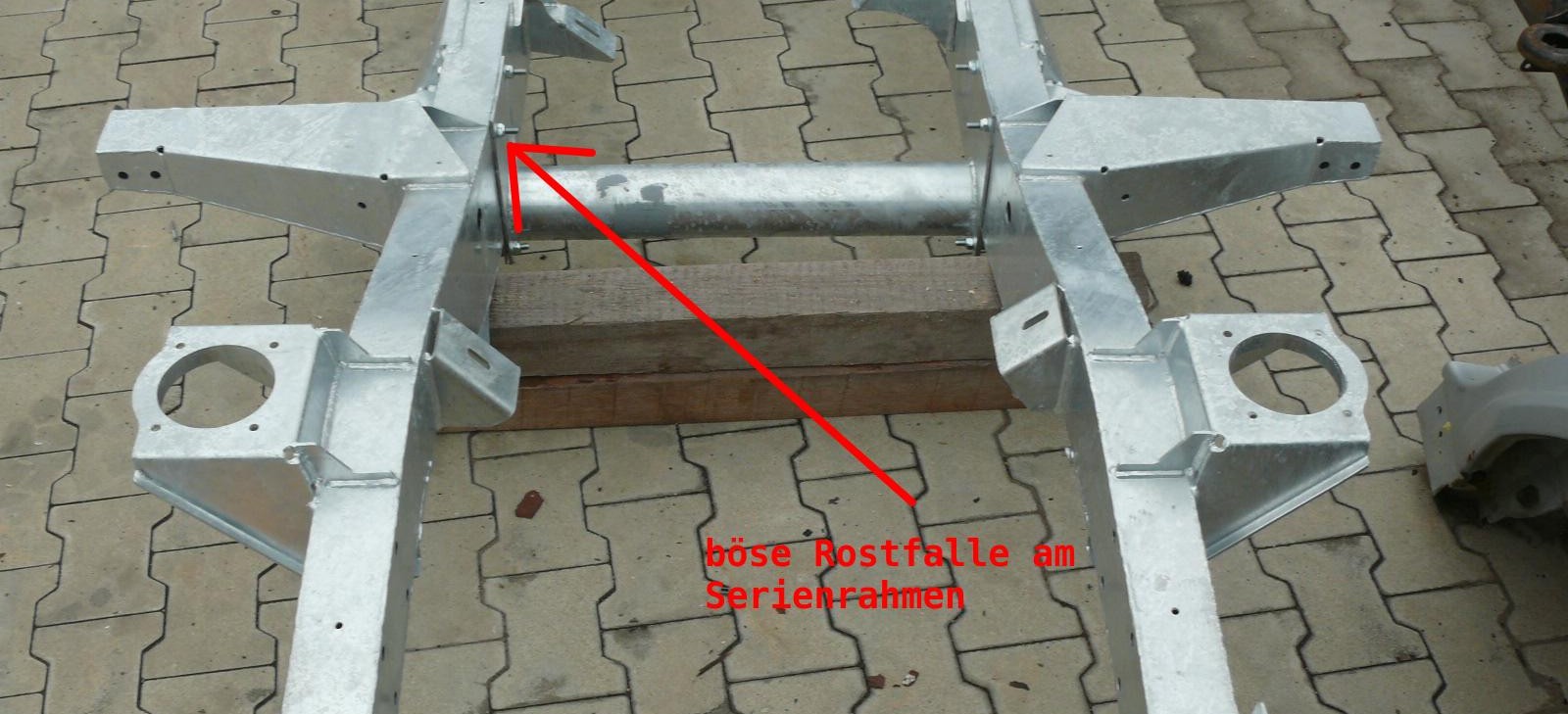 Mein eigenes feuerverzinktes Chassis ist ja inzwischen nicht mehr so pflegebedürftig und deshalb fettfrei. Das geniest man als Hobbyschrauber sehr, denn es spart viel Dreck von der hartnäckigsten Sorte am Unterboden. Wenn man aber noch kein verzinktes Cassis hat, muss man wohl oder übel mit viel Fett und Wachs arbeiten, wenn man den Rahmen lange erhalten will. Das betrifft vor allem den Rahmen innen, aber auch versteckte Stellen, wo die Getriebetraverse mit grossen Platten verschraubt ist. Hier ist immer eine Wasserfalle und oft rosten die Rahmenhauptträger hinter diesen Platten durch. Meine Idee ist, in der Anschlussplatte der Traverse einen oder zwei Schmiernippel einzubringen, damit man durch Einpressen von Fett evtl. eingedrungenes Wasser verdrängen kann. Es mag etwas befremdlich wirken, denn hier muss ja nichts geschmiert werden, aber das dürfte diese Stelle zuverlässig schützen, wenn man beim üblichen Abschmieren auch hier Fett hinein presst. Wenig Aufwand bei der Herstellung, wenn die Traverse zB beim Kupplungswechsel sowieso ausgebaut ist, aber große Wirkung. Für den ganzen Rest weiß man beim Korrosionsschutzdepot gut Bescheid.