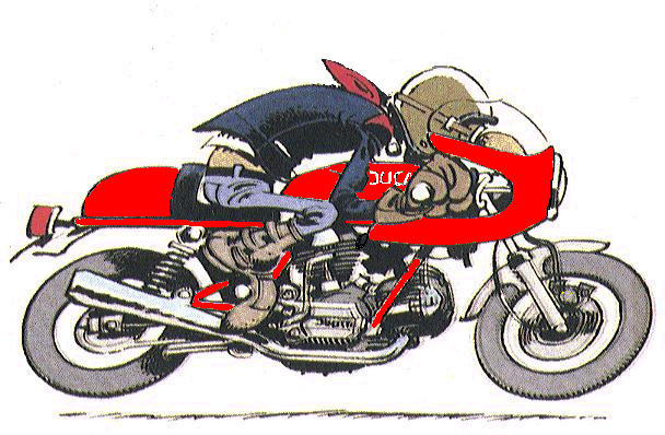 Sie hat mit 1500 mm einen recht langen Radstand, der zusammen mit dem flachen Lenkwinkel (von 64°, soweit ich mich erinnere) und dem daraus resultierenden langen Nachlauf von 120 mm zu aussergewöhnlich guten Geradeauslaufeigenschaften und extremer Stabilität in langen Kurven führt. Die (nicht überragende) Handlichkeit kam vom niedrigen Gewicht und dem niedrigen Schwerpunkt. Lange Kurven sind ihr Metier. Man merkte in Bezug auf die Handlichkeit immer genau den Unterschied zwischen dem niedrigen Imolahöcker und der über 10 cm höheren Doppelsitzbank. Beim Imolahöcker nahm man fast auf dem Rahmen Platz und die Wendigkeit verbesserte sich sofort.